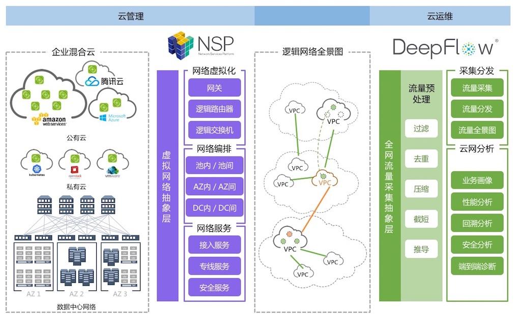 多数企业上云的过程中背负着不同程度的历史包袱,通常也都面临网络的统一规划和长期演进问题。针对企业上云过程中IT架构的特点,云杉网络推出NSP产品,聚焦于多云互联、网络边界服务及相关的网络运维问题。根据企业现有的IT和网络环境,NSP通常有如下三个功能场景:网络虚拟化,采用网络Overlay方案,为企业的新建资源池提供虚拟网络服务;网络编排,面向多资源池场景,提供统一的逻辑网络;网络服务,为网络边界(包括ISP和DCI接入)提供统一纳管的服务平台,可对企业现有的物理网络设备和安全网络设备进行统一管理和抽象,实现网络服务的自动化交付,解耦不同厂商网元设备带来的复杂性。而DeepFlow以云网络流量数据的Flow信息采集、处理、分析为闭环,主要解决云数据中心网络的智能运维、精细运营、安全告警等难题,DeepFlow的优势包括可以轻松管理1000节点以上规模集群、填补数据中心传统监控手段无法采集虚拟流量的空白,而高效的包过滤和压缩算法以及流量回溯能力可以快速定位故障、还原事故现场,一站式解决运维排障的难题。