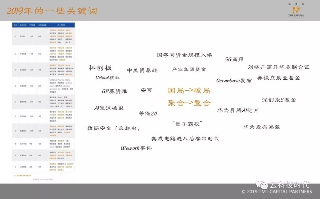 上图列举了一些关键词,同时左边有一张统计表,统计了一些大型基金或者是知名基金在科创板的数量,深创投8家、中金资本8家、元禾控股6家、松禾资本6家、同创伟业5家、海通开元3家、红杉1家、高瓴0家。而在境外IPO的科技和服务类企业,IPO之后三年内能够既做大又做强的,到目前为止还没有出现。那么围绕着困局找出路、破局,科创板是更高层面的破局方法,包括配套S基金、刘晓丹从华泰联合证券总裁位置上离开去做并购基金等都在指向一个趋势,就是从“散”变为“聚”,创投两侧都要开始聚合。